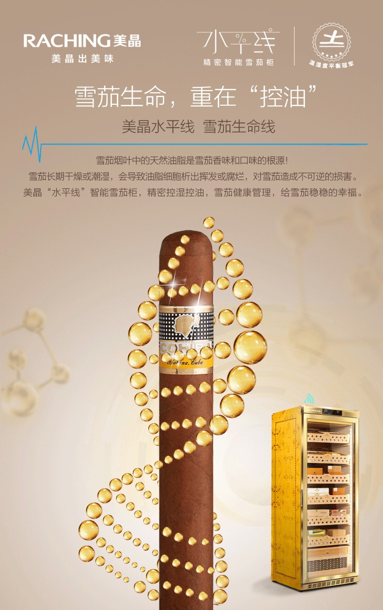 美晶養(yǎng)茄新觀念:雪茄為什么要恒溫恒濕儲(chǔ)存?奧妙全在雪茄“油脂”上!雪茄過(guò)度出油及“開(kāi)花”并不是件好事。美晶“水平線”精密智能雪茄柜,一款能精密控濕控油的雪茄柜.