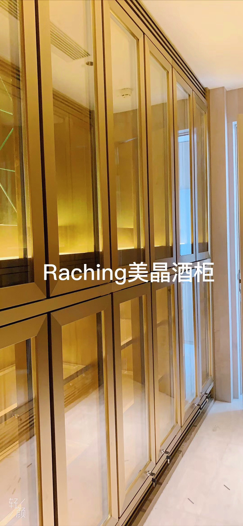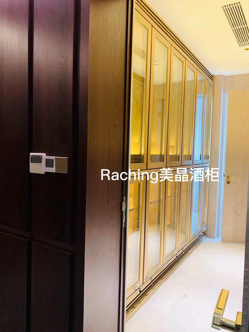 美晶此次為其打造的恒溫酒柜具備以下特點:香檳金不銹鋼定制恒溫酒柜+影木飾面板、護墻板+高光鋼琴漆,打造典型的輕奢風。