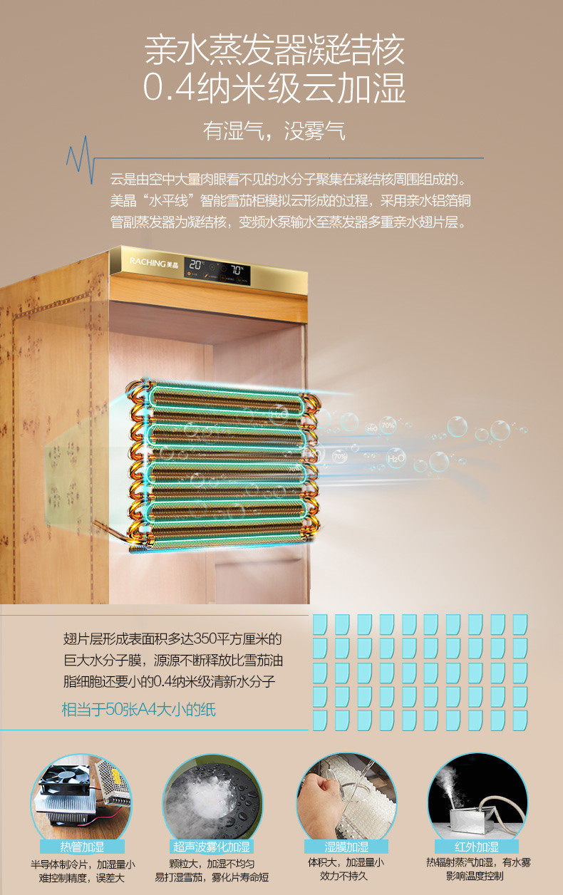 云是空氣中大量肉眼看不見的水分子聚集在凝結(jié)核周圍形成的,美晶水平線精密智能雪茄柜,模擬云形成的過程,行業(yè)獨(dú)創(chuàng)無需任何耗材“云加濕”概念。