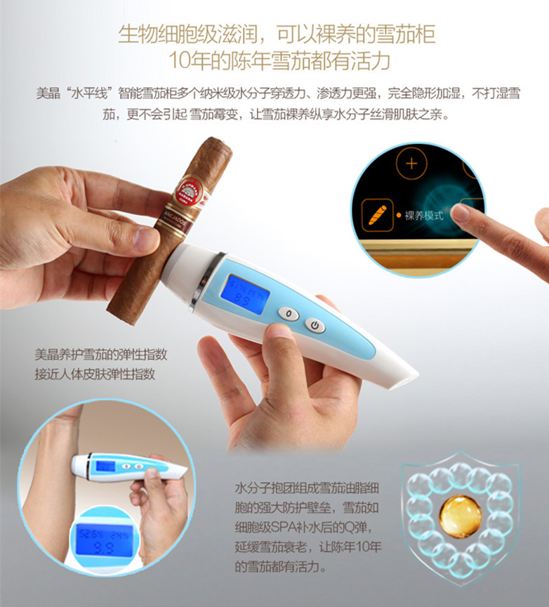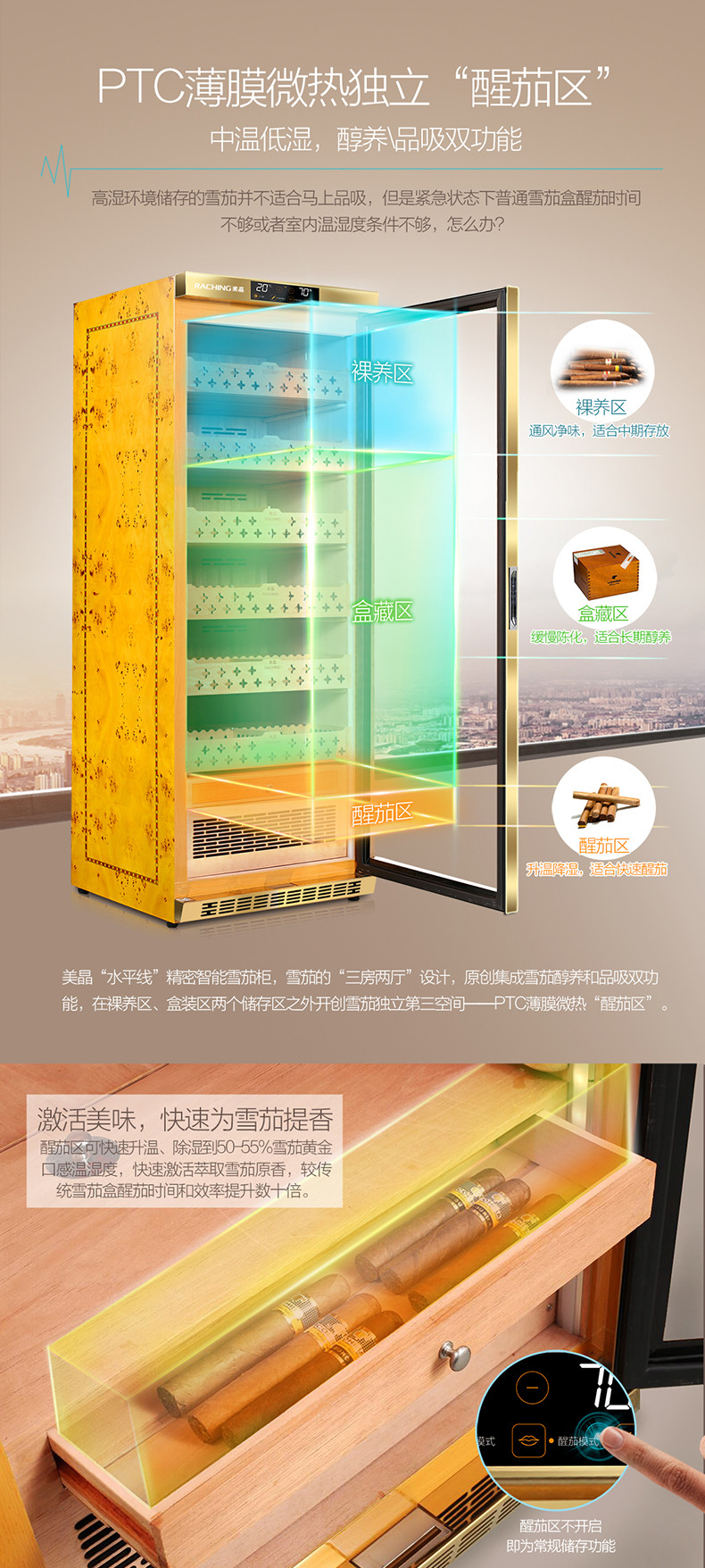 品吸雪茄的最佳濕度比儲(chǔ)存濕度低。美晶“水平線”精密智能雪茄柜,雪茄的“三房兩廳”設(shè)計(jì),全球獨(dú)創(chuàng)PTC微熱薄膜獨(dú)立“醒茄區(qū)”,中溫低濕,醇養(yǎng)/品吸雙功能,快速激活萃取雪茄原香。