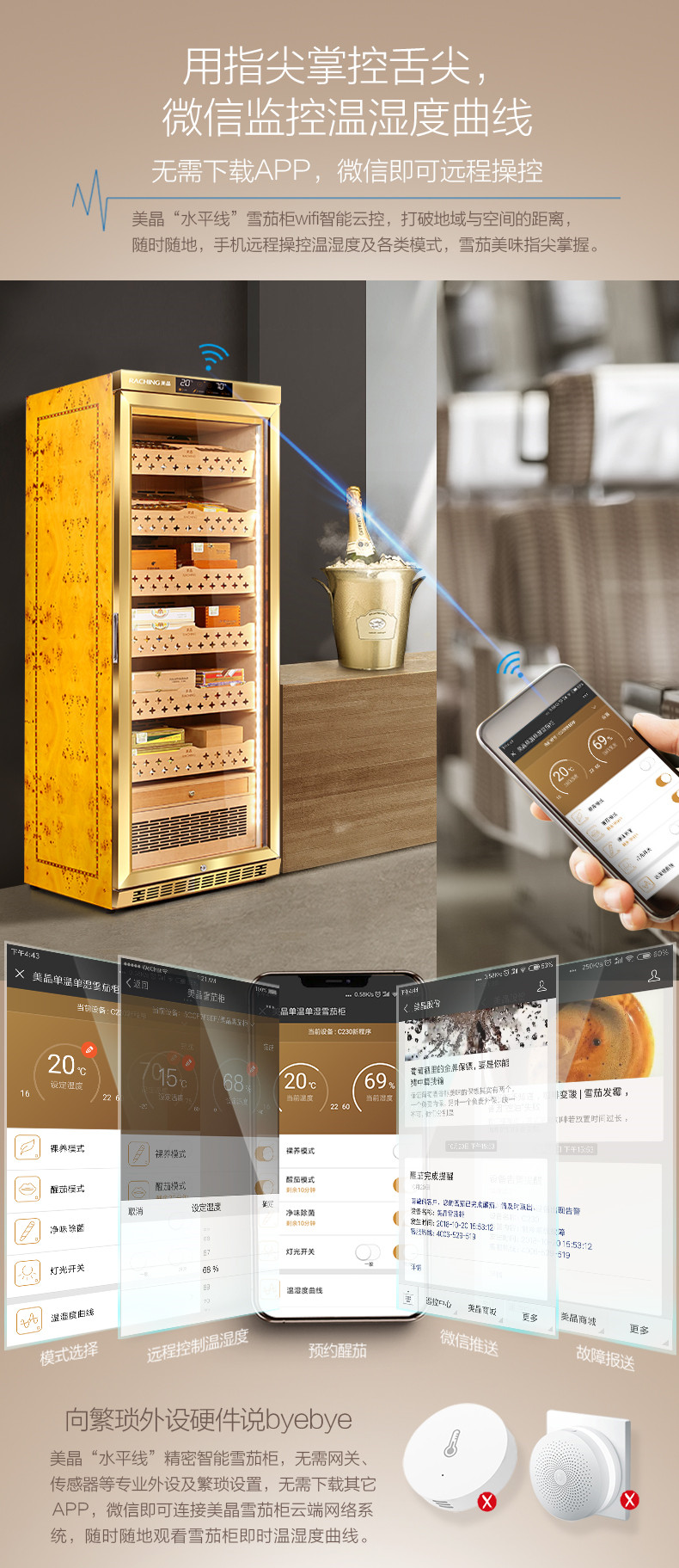 美晶“水平線”精密智能雪茄柜,用指尖掌控舌尖,微信遠(yuǎn)程操控各類模式。更無需小米溫濕度傳感器、網(wǎng)關(guān)外設(shè)及繁瑣設(shè)置,微信即可隨時(shí)隨地查看雪茄柜溫濕度曲線。行業(yè)獨(dú)創(chuàng)!