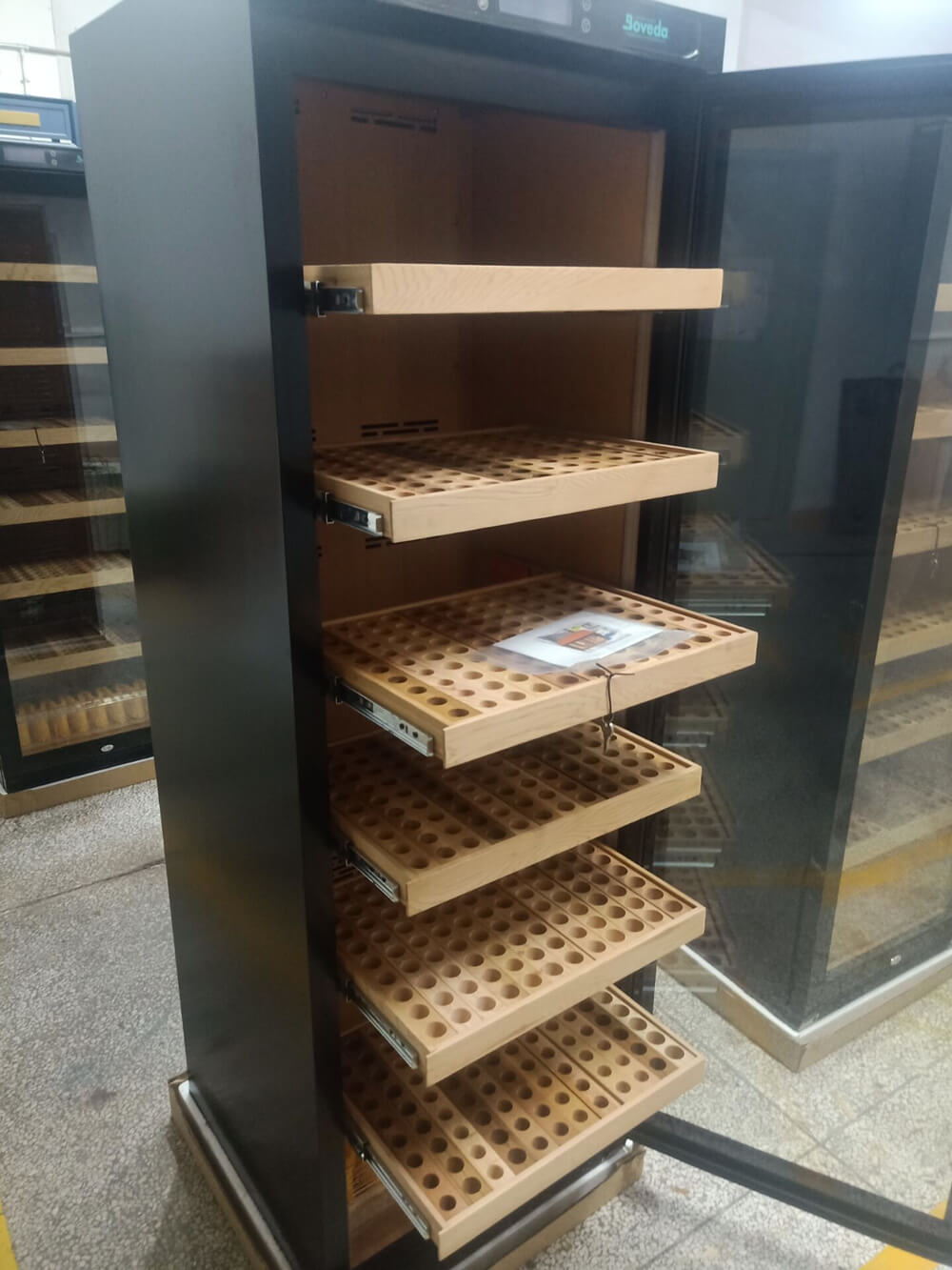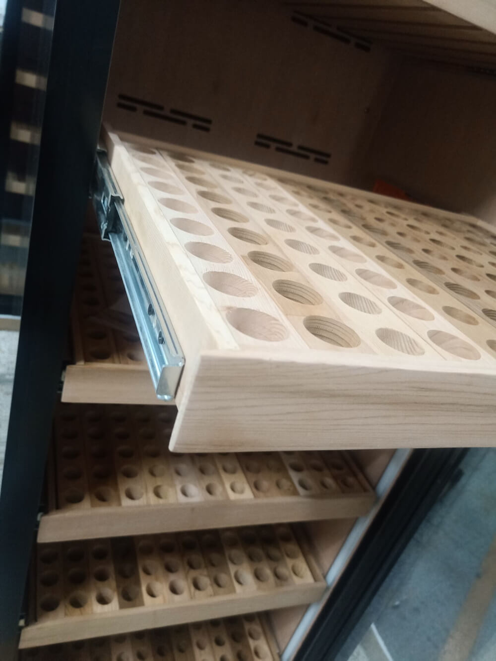 非古雪茄中,尤其美國(guó)的雪茄尺寸及造型更是多變,該客戶訂購的雪茄柜每一層雪松木實(shí)木層架均能豎放108支雪茄,層架上的每一個(gè)孔徑也都大小都不一,能存放不同環(huán)徑尺寸的雪茄。