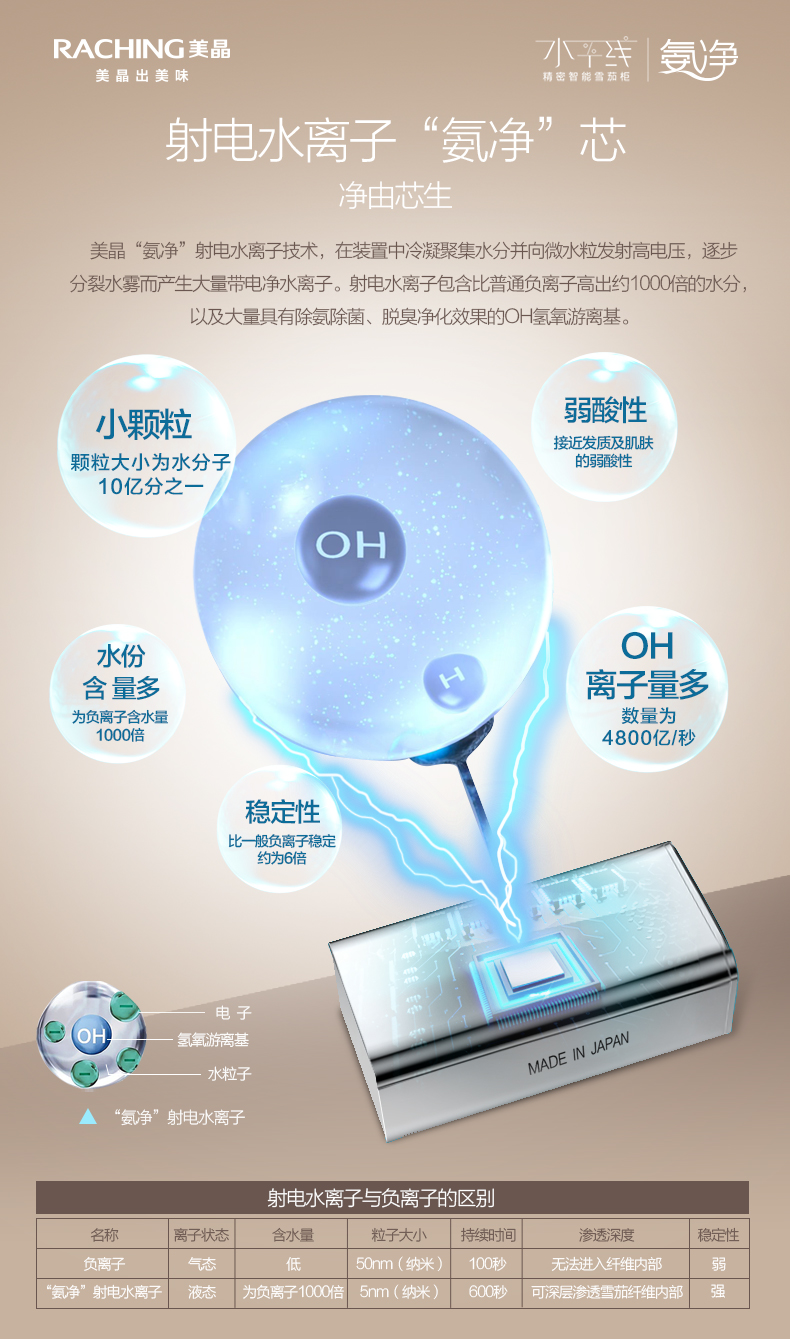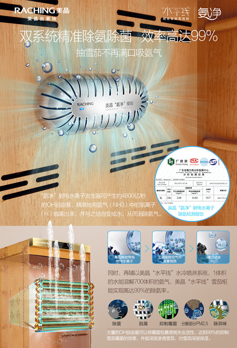 有“氨凈”,更醇凈!美晶“水平線”雪茄柜全球首創(chuàng)射電水離子除氨技術(shù)。日本松下進(jìn)口核心配件,可產(chǎn)生約4800億個/秒的OH氫氧自由基,可精準(zhǔn)地將氨氣NH?中的氫離子H抽離,并與之結(jié)合變成水,消除氨氣。